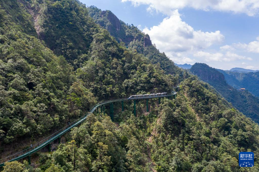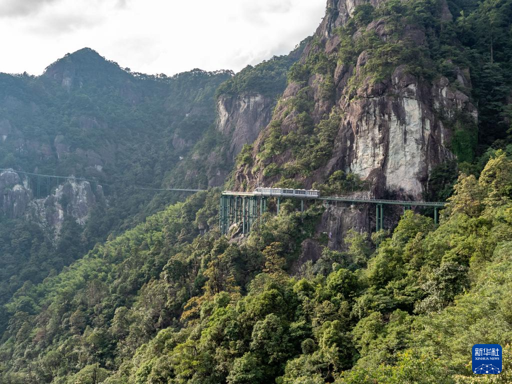 7月10日,“悬崖动车”行驶在江西大觉山景区。新华社记者 郭杰文 摄
