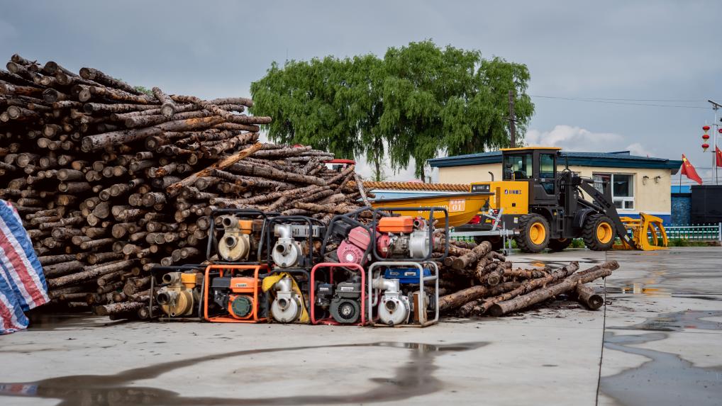 图为吉林省榆树市防汛物资储备库院内储备的木桩、发电机、挖掘机等物资设备(7月5日摄)。新华社记者 段续 摄