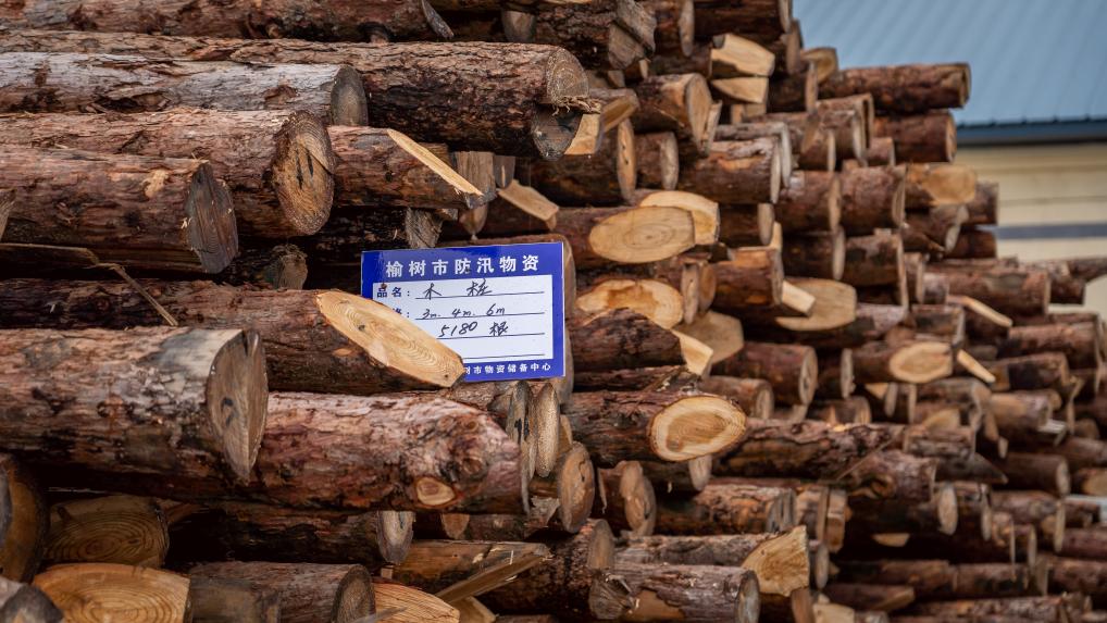 在吉林省榆树市防汛物资储备库院内,木桩一端被削尖备用(7月5日摄)。新华社记者 唐成卓 摄
