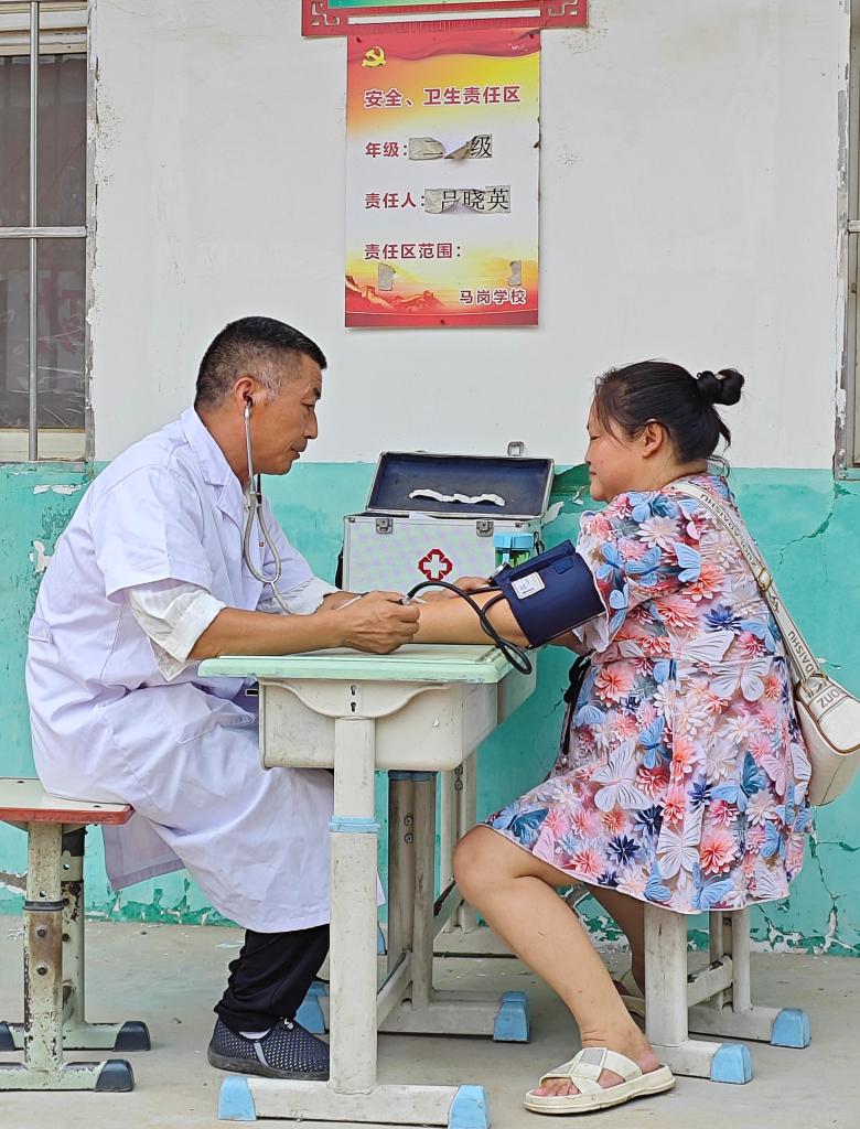 7月17日,在南阳市唐河县郭滩镇马岗村小学安置点,镇卫生所医生正在为居民量血压。新华社发(郑家宝摄)