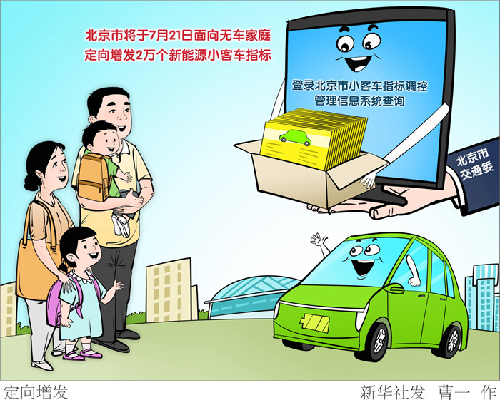 新华社北京7月19日电(记者张骁)记者19日从北京市交通委获悉,为逐步解决无车家庭用车需求,北京市将于7月21日面向无车家庭定向增发2万个新能源小客车指标。
