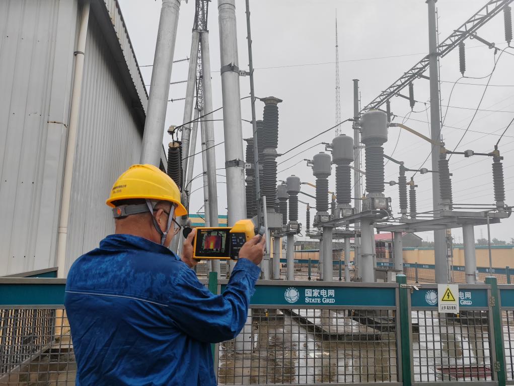 7月23日,国网莱阳市供电公司工作人员在变电站用红外测温仪对设备进行测温巡视。(受访者供图)
