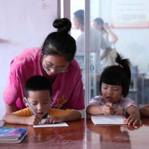 7月24日,在惠水县芦山镇朝阳社区新时代文明实践站内,天津工业大学风筝支教团成员正在指导小朋友练字。新华社记者郑明鸿 摄