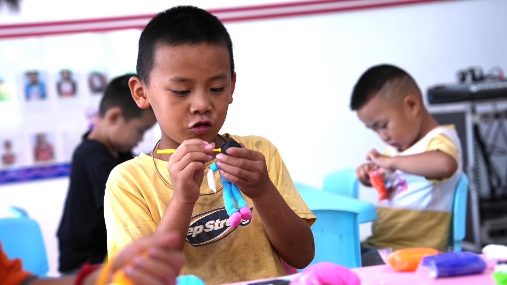 7月24日,在惠水县岗度镇龙泉村新时代文明实践站内,一名小孩正在玩橡皮泥。新华社记者郑明鸿 摄