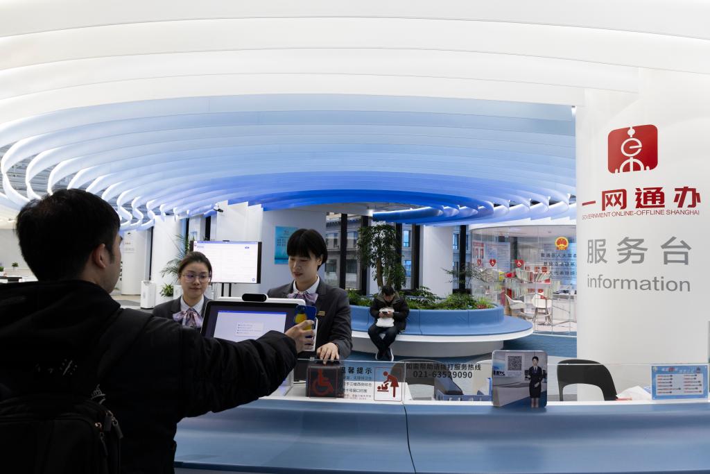 工作人员在上海市黄浦区行政服务中心服务台为市民提供咨询服务。新华社记者 金立旺 摄