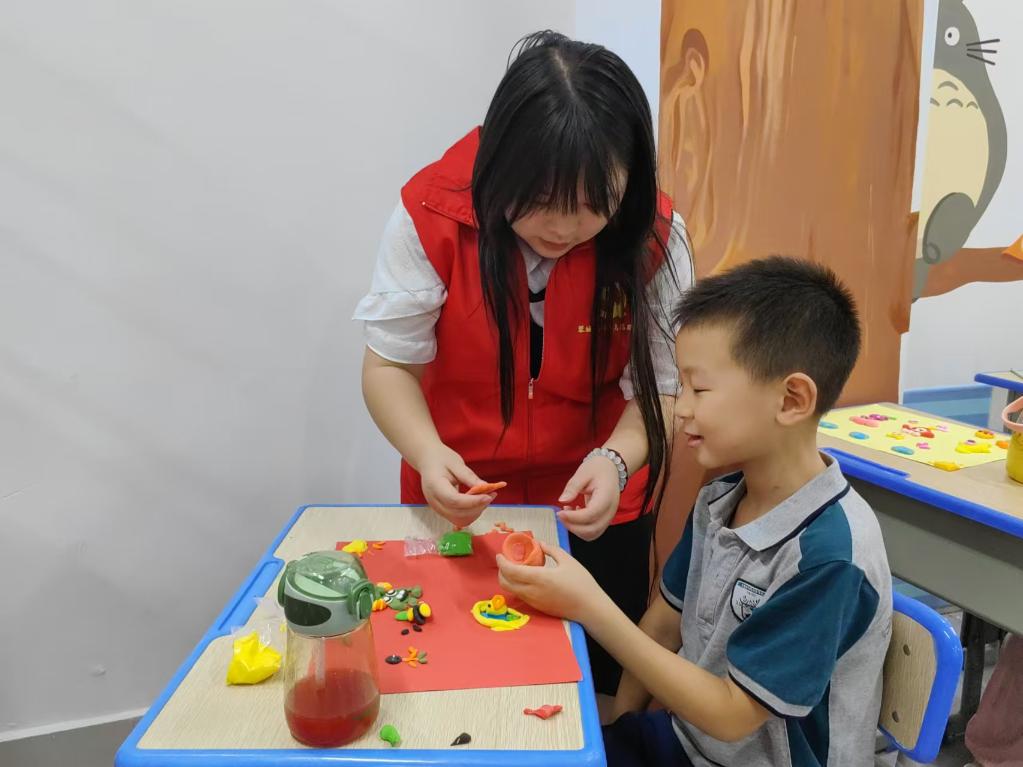 7月25日,在成都高新区临江社区党群服务中心一楼的儿童共享空间,志愿者卢玥在指导小朋友做手工。新华社记者董小红 摄