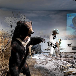 在展示馆二楼活态展示区,赫哲族演员头戴鹿角帽,身穿民族服装,跳起热烈的“温吉尼”舞蹈,为前来参观的游客带来一场神秘又震撼的视听盛宴。表演结束后,游客还可以走上舞台,和演员们学习萨满舞的舞蹈动作,体验赫哲族古老的文化。