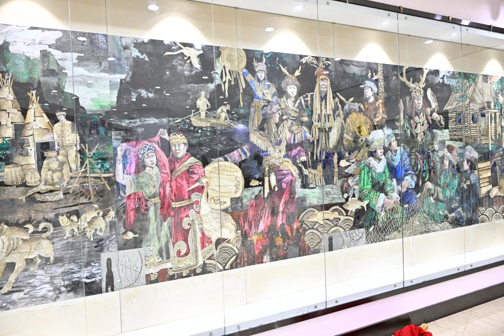 同江市非物质文化遗产展示馆中描绘赫哲族传统生活的壁画。新华社记者 丁赫 摄