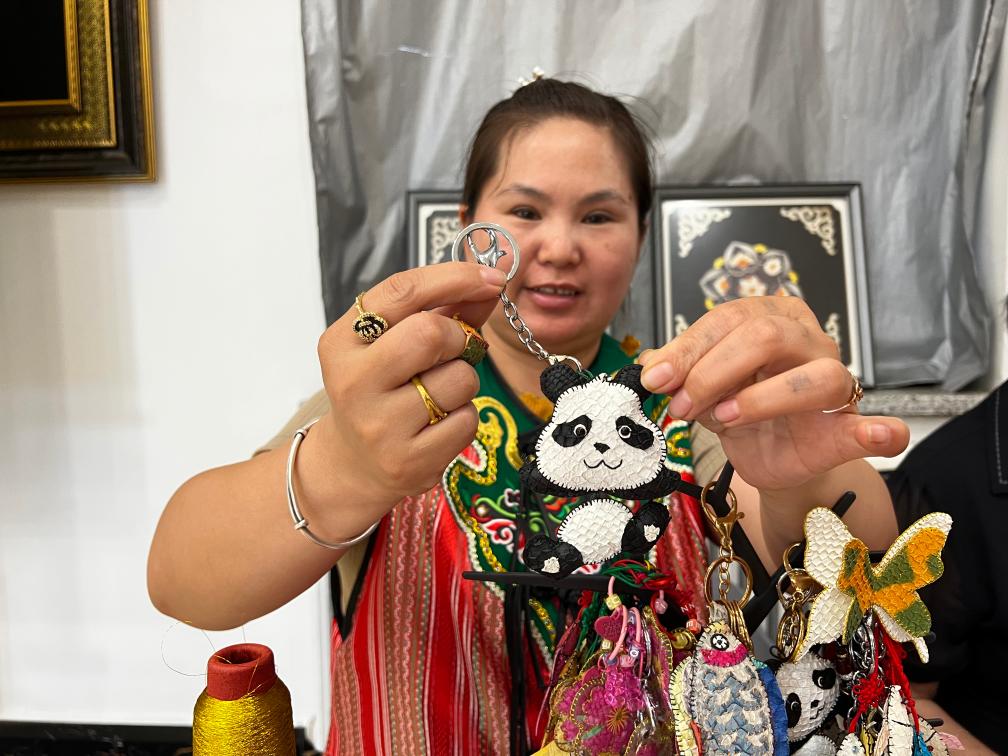 同江市非物质文化遗产展示馆内,赫哲鱼皮匠人展示由她制作的大熊猫鱼皮挂饰。新华社记者 杨轩 摄