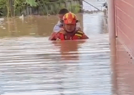 7月29日,湖南湘潭涓水漫堤决口,洪水淹没大量房屋,一名小男孩被困,消防人员随即展开救援,由于积水较深,救援人员背着男孩慢慢淌过,给了男孩满满的安全感。有网友说,这一刻,他的肩膀就是最坚持的依靠。