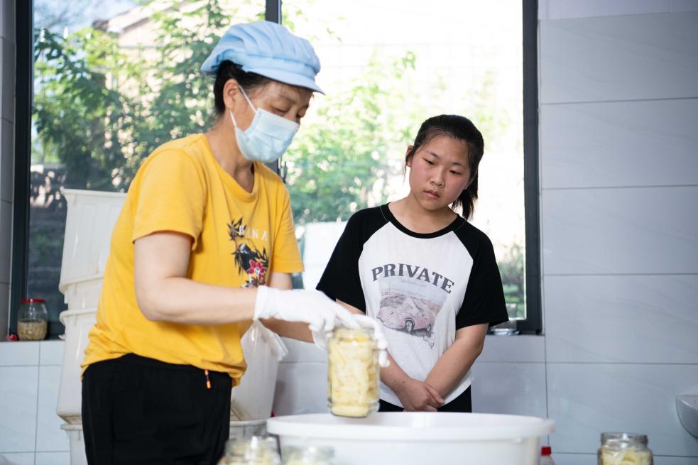 从白姜的种植、收获,到腌制、包装,朱晴雨全程参与。力气小的她还不能轻松挥动锄头,就多干一些除草、刮姜、搅拌糖醋、叠包装盒等较为轻松的劳动,帮家人减轻负担。