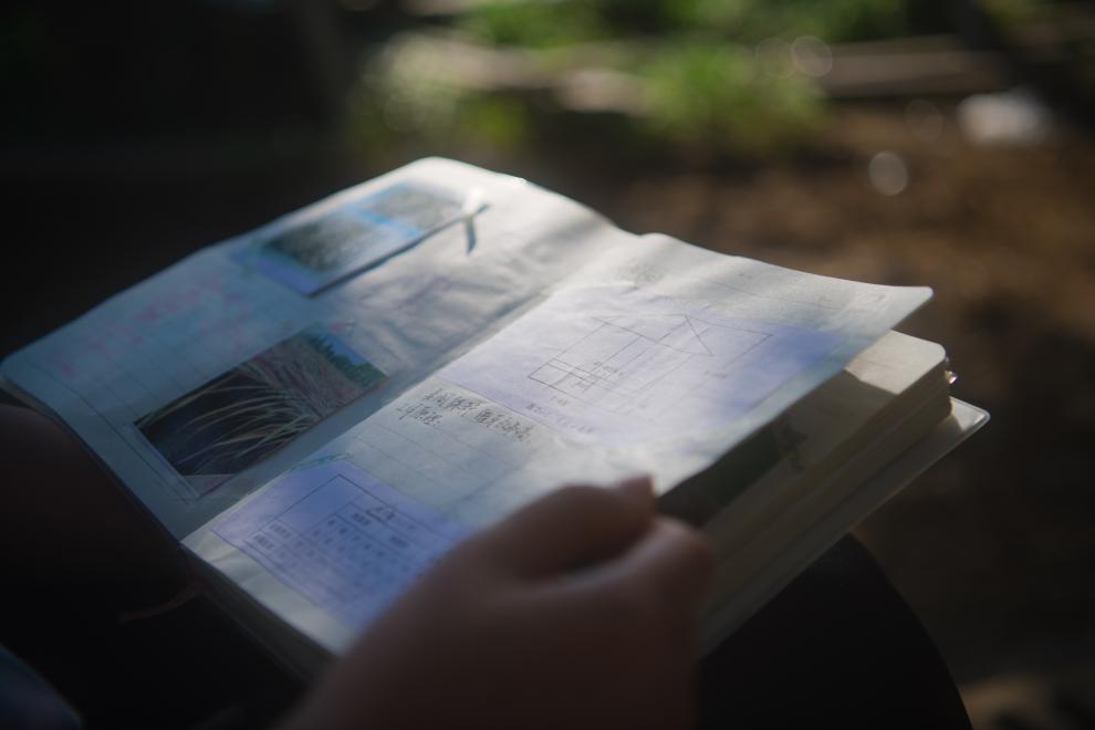 早上七点,家住铜陵市义安区天门镇新华村的15岁女孩朱晴雨出现在自家的白姜田里。“随着姜苗逐渐长大,它们越来越需要阳光,我们就把遮阳网一层层撤掉。”说起白姜的种植要点,朱晴雨如数家珍。她的爷爷朱树清正在田里给姜苗培土,朱晴雨在一旁观察姜苗的叶片状态,不时在笔记本上记上几笔。笔记本里记录了白姜种植的各种知识,除了图片和文字摘录,也有不少她的想法心得。