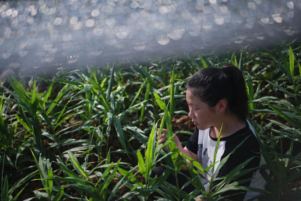 7月24日,在安徽省铜陵市义安区天门镇新华村,朱晴雨在自家白姜田里观察记录姜苗状态。新华社记者 傅天 摄