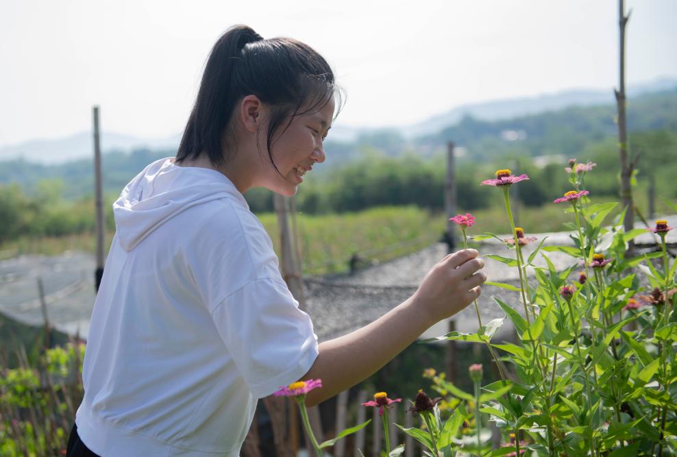 7月23日,在安徽省铜陵市义安区天门镇新华村,朱晴雨在家门口欣赏爸爸种的花。新华社记者 傅天 摄