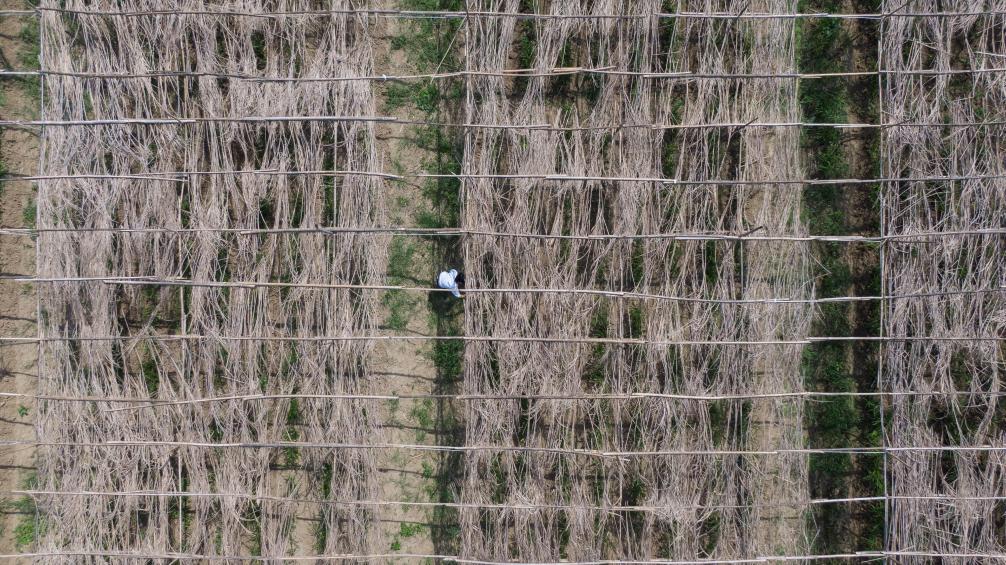 7月23日,在安徽省铜陵市义安区天门镇龙山村,朱晴雨在采用芭茅搭棚遮阴传统方法的白姜田里劳作(无人机照片)。新华社记者 傅天 摄