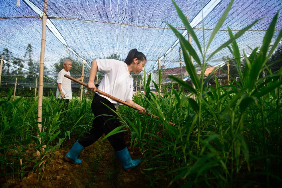 7月23日,在安徽省铜陵市义安区天门镇新华村,朱晴雨在自家白姜田里给姜苗培土。新华社记者 张端 摄