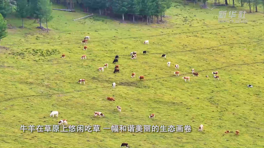 7月底,新疆阿勒泰夏牧场水草丰美,牛羊在草原上悠闲吃草,一幅和谐美丽的生态画卷。