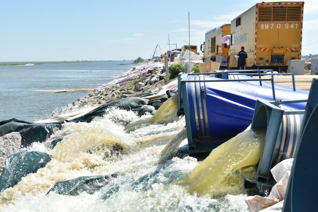 在排涝任务最艰巨的时候,团洲垸大堤上的排涝车望不到尽头,机器轰鸣,水流滚滚。7月31日,团洲垸排涝工作基本结束,大部分设备撤离,只留下少数队伍进行扫尾作业。