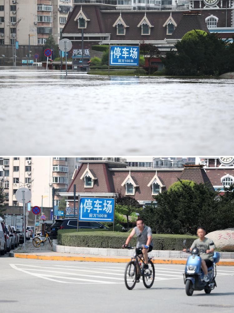 拼版照片:上图为7月30日在丹东市滨江中路拍摄的指示牌;下图为8月3日在丹东市滨江中路拍摄的指示牌。新华社记者 龙雷 摄