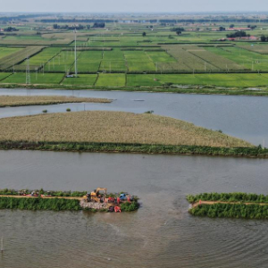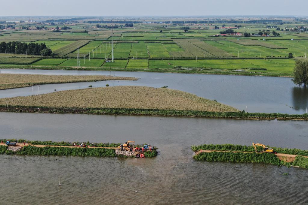 8月6日,抢险人员在王河溃口处进行封堵工作(无人机照片)。新华社记者潘昱龙 摄