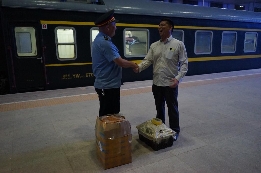8月1日,列车长坡拉提汗(左)和依马买买提·赛帕尔(右)在和田站站台话别。新华社记者靳博文 摄