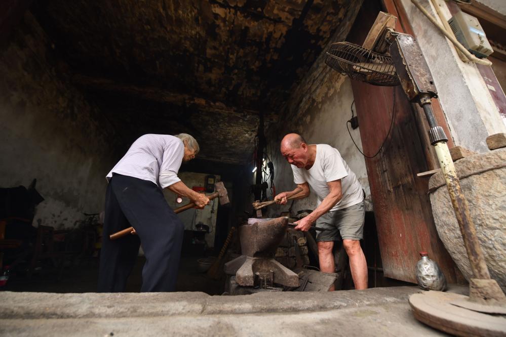 在柳州市柳江区三都镇三都社区,83岁的韦初元和80岁的老伴韦秀依经营铁匠铺已经有60年。在打铁现场,你一锤我一锤,两人配合十分默契,打铁的声音极富韵律感。