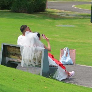 一对新人在成都市金牛区府河摄影公园婚姻登记处外的草坪上拍照。新华社记者 周以航 摄