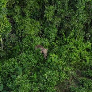 近日,在云南西双版纳国家级自然保护区勐养片区边缘,颈部佩戴项圈的阿宝,独自在山林间穿梭觅食。亚洲象监测员站在远处,用无人机密切关注着它的一举一动。