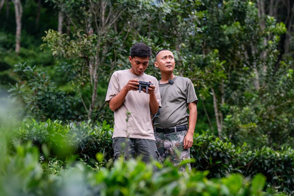 8月10日,亚洲象监测员杨军(右)和同事在使用无人机监测阿宝的行踪。新华社记者胡超 摄