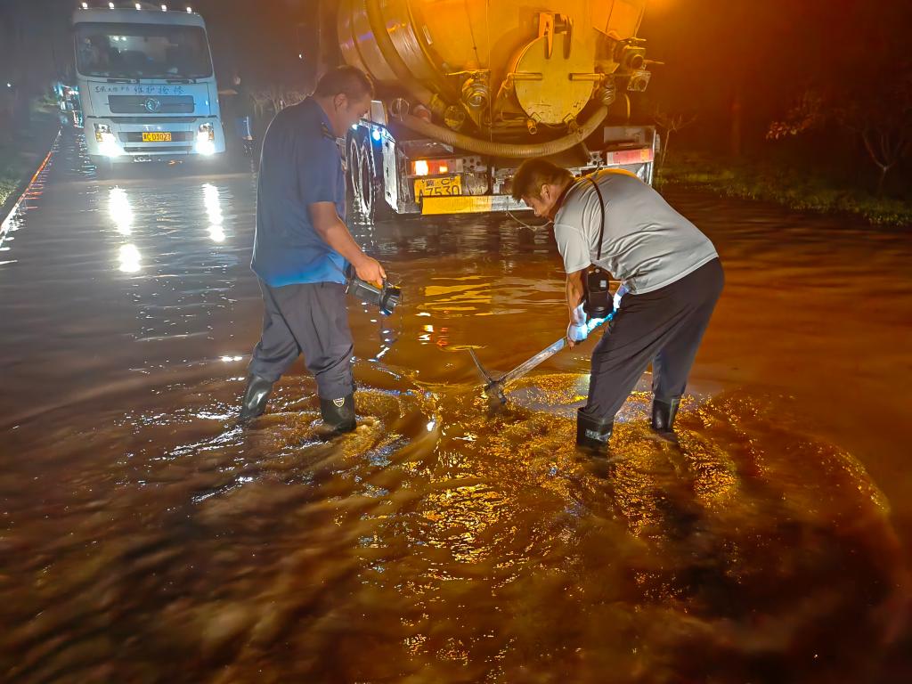 7月底,北戴河新区突降大雨,辖区主干道滨海新大道道路积水严重,防汛应急队队员连夜开展积水抽排作业。新华社发(受访者供图)