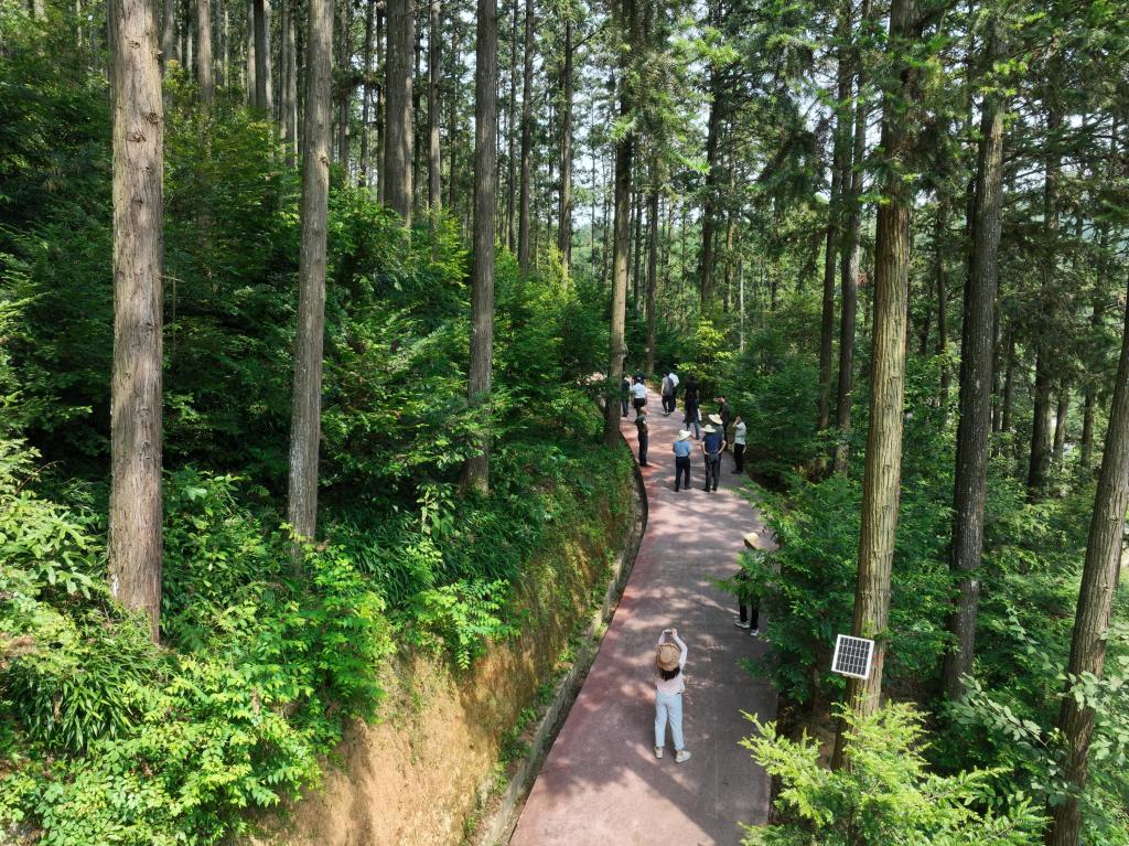 8月10日,参观者前往福建三明沙县官庄国有林场参观(无人机照片)。新华社记者姜克红 摄