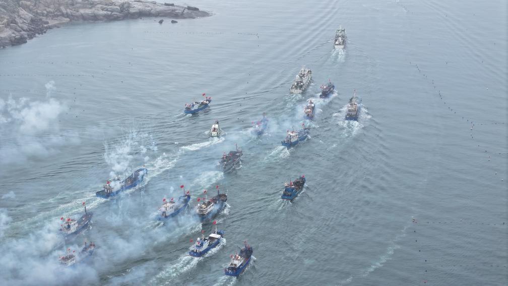12时一到,渔船鱼贯而出,快速驶离码头。海面船影点点,一个渔民的家人告诉记者,千百年来,渔民们在出海前总要祭大海,祈求平安、丰收,形成了“开渔”“开海”的传统民俗活动。
