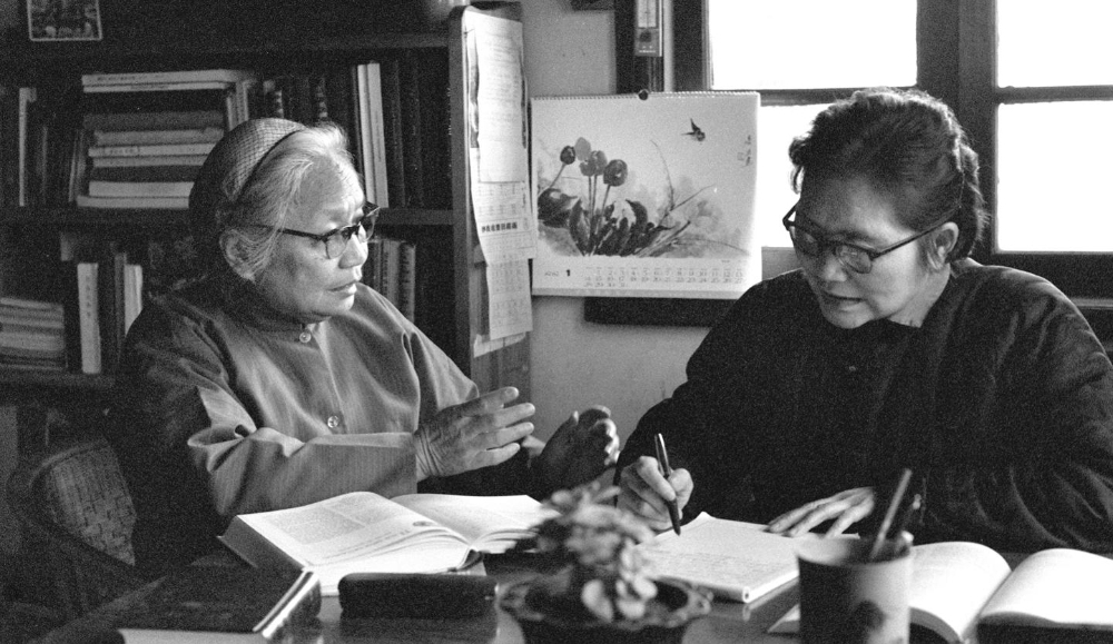 20世纪70年代,乐以成(左)和助手一起修订书籍。
