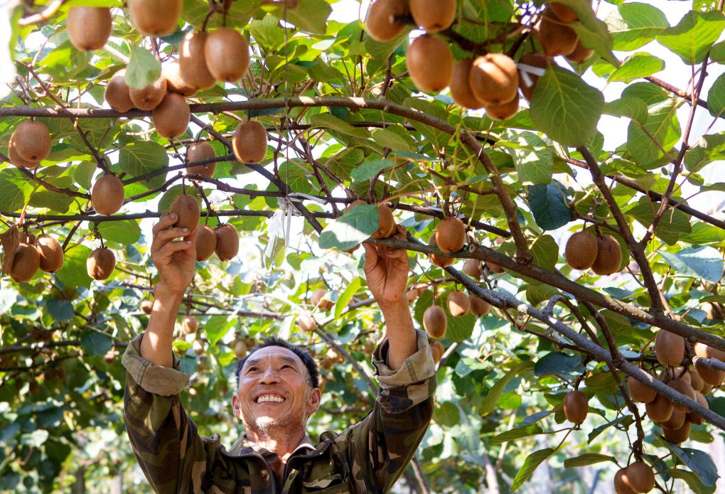 在万盛经开区黑山镇南门村的一处果园中,村民正在采摘猕猴桃。(曹永龙 摄)
