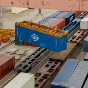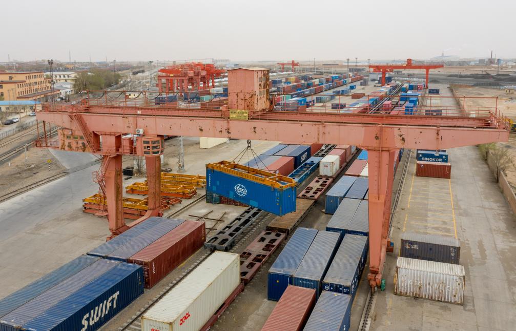 4月21日,二连浩特铁路口岸龙门吊吊装中欧班列集装箱(无人机照片)。新华社发(张海峰摄)