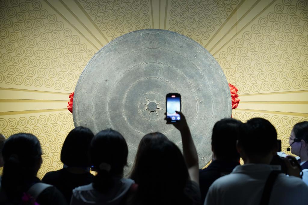 8月24日,参观者在广西民族博物馆的铜鼓前参观。新华社记者 尹栋逊 摄