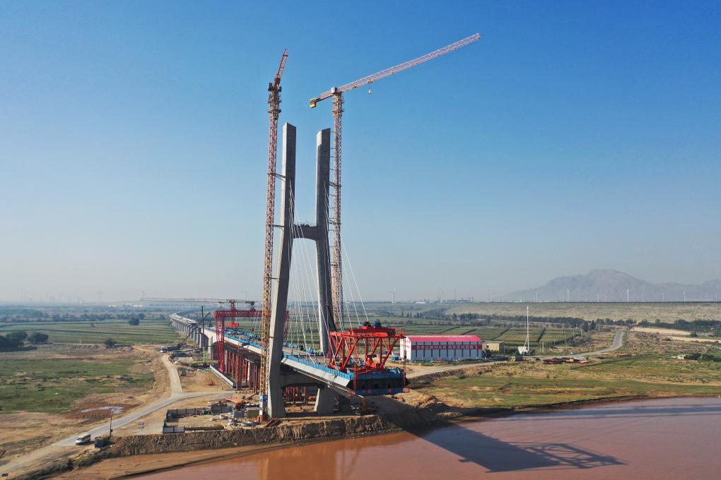 2022年6月,乌海黄河特大桥开工建设,如今主桥百米双塔已成功封顶,目前正在进行主桥中跨钢箱梁拼装及挂索施工。“我们预计在今年10月实现钢箱梁合龙,明年3月完成调索及附属施工,明年5月底完成铺轨施工。”说起工程建设进展,徐鹏的话语中充满自信。