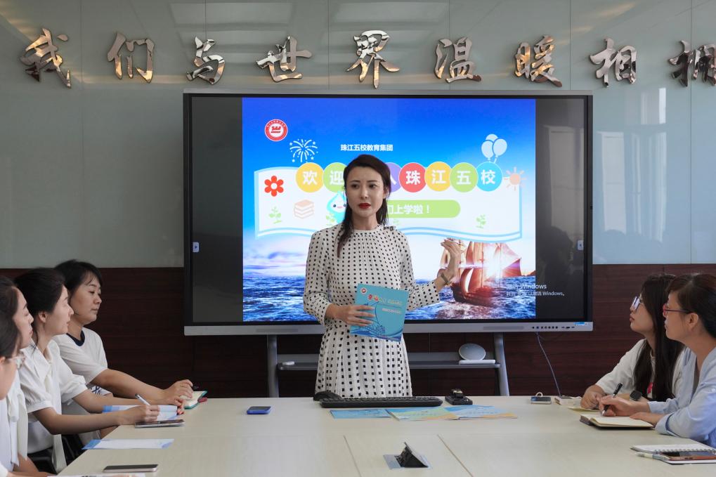 一年29班教室内,班主任杨晓莹正向参加见面会的新生和家长介绍入学注意事项,希望帮助孩子们尽快适应小学学习生活。新学期,珠江五校教育集团家庭教育指导团队联合入学适应项目组分析总结了小学一至六年级各年段学生行为、心理、身体发育等方面特点,编写了小水滴入学前适应手册、学校家庭教育指导手册等一整套指导手册,有针对性地实现家校合力共育。