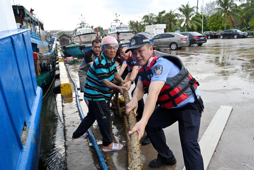 4日下午,海南省琼海市潭门海岸派出所民警帮助辖区群众加固回港渔船缆绳。(新华社发 吴凡 摄)