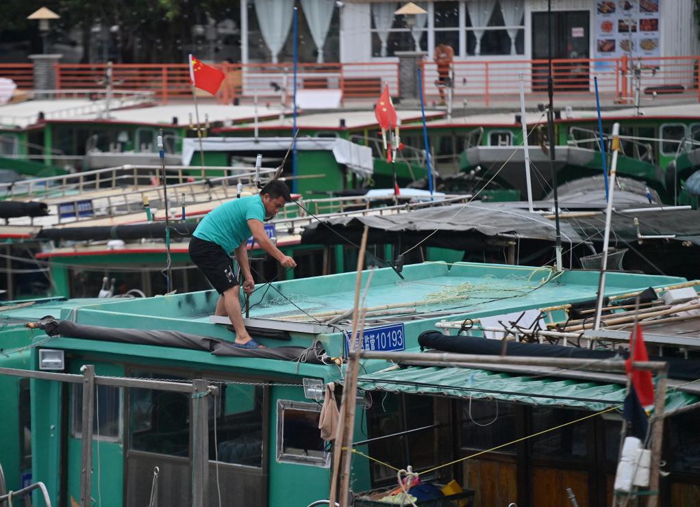 9月6日,在广西北海市侨港镇电建渔港码头,渔民在加固船只,准备撤离上岸。新华社记者 黄孝邦 摄