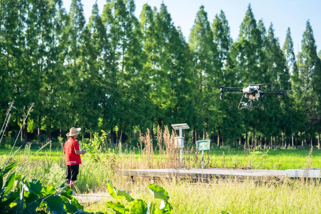 7月19日,在南县麻河口镇东胜村,毛竹青在操作农用无人机。新华社记者 陈思汗 摄