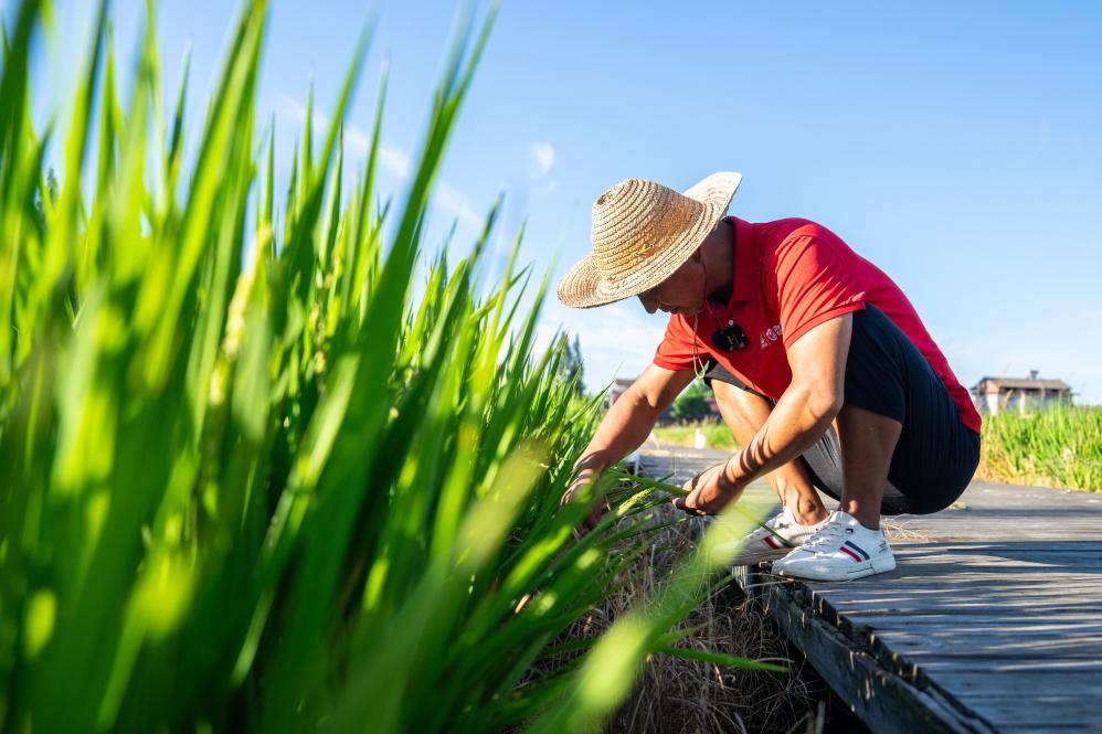 7月19日,在南县麻河口镇东胜村,毛竹青在观察水稻生长情况。新华社记者 陈思汗 摄
