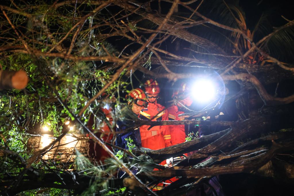 在铺前镇,狂风骤雨造成大量树木倒伏,多条道路阻断,电力、通讯也先后中断,这里成了“孤岛”。6日晚11时,趁着风势、雨势转弱,20多名消防队员兵分两路,努力打通铺前镇到海口市、铺前镇到锦山镇方向的道路。