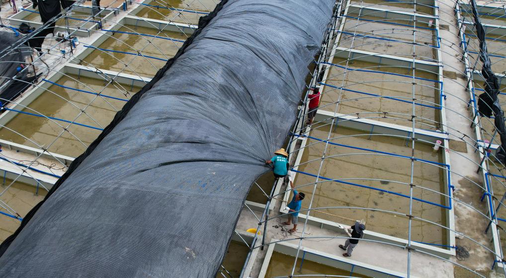 在文昌市翁田镇的海兴农翁田虾苗场,工人重新铺设顶棚。无人机照片,新华社记者杨冠宇 摄
