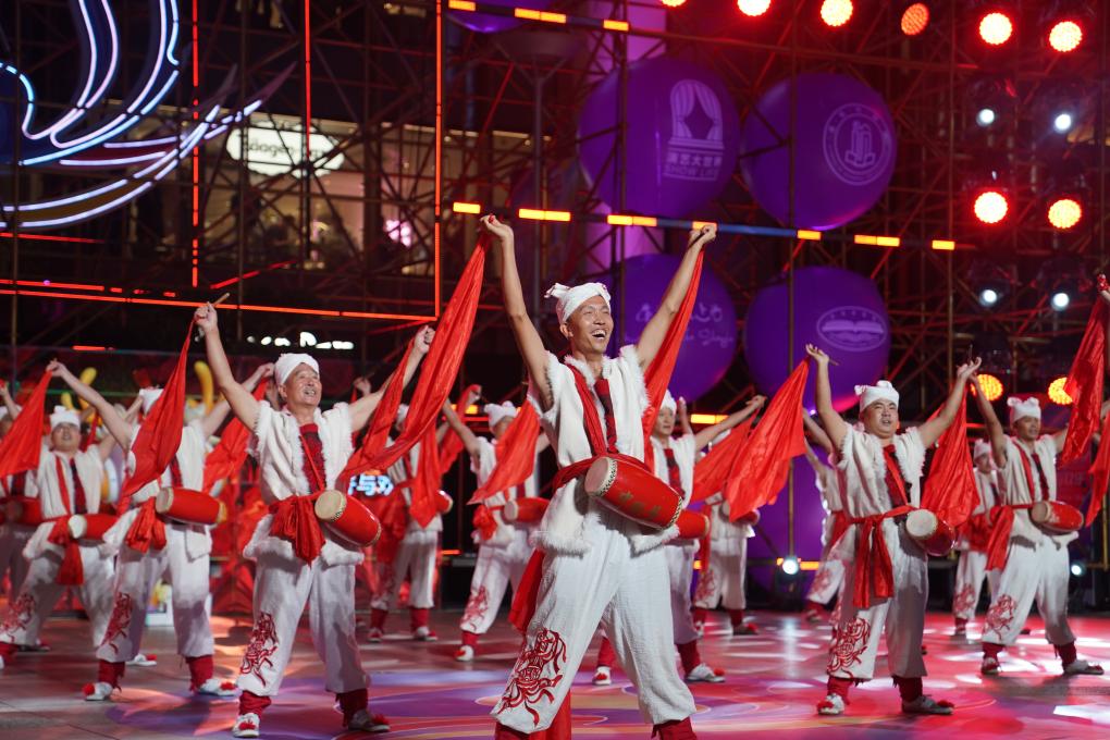 9月14日,来自陕西延安的安塞腰鼓表演团亮相开幕巡游。新华社发(陈浩明 摄)