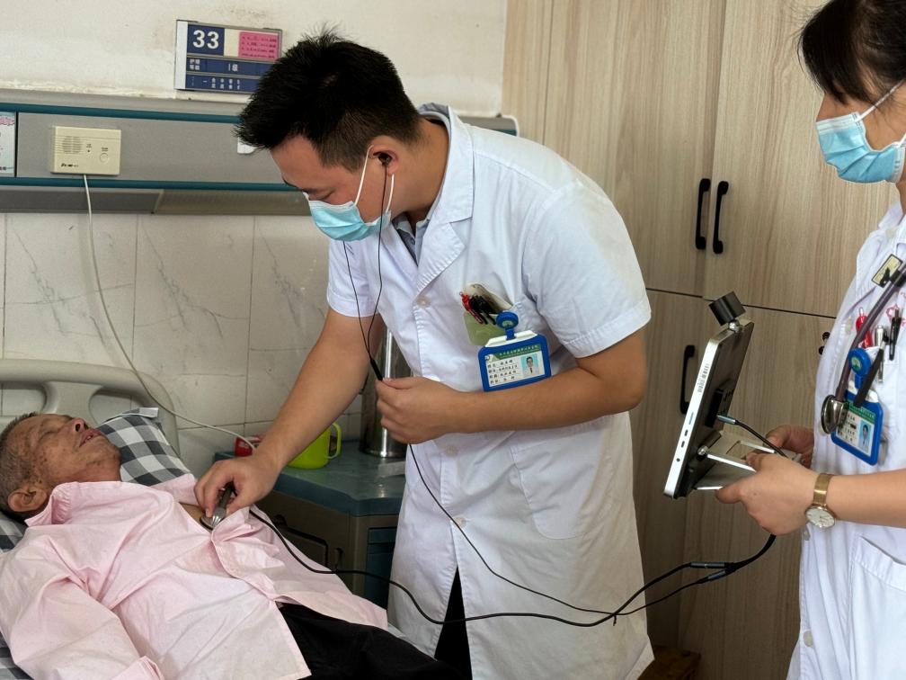 通过远程医疗,苏丽玲在县人民医院不仅可以问诊村卫生室的病人,还能为乡镇卫生院的患者提供远程查房。灵川县大圩镇中心卫生院医生赵杏群将分布式移动远程终端机带到了患者床旁,并连接远程听诊器。赵杏群操作听诊器时,屏幕另一端的苏丽玲透过耳机可同步听到患者的心跳声。