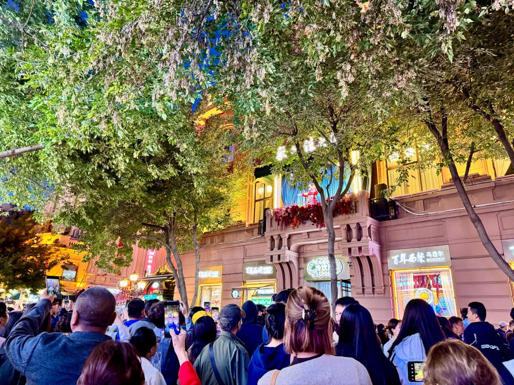 市民和游客在哈尔滨中央大街游玩。新华社记者 刘赫垚 摄