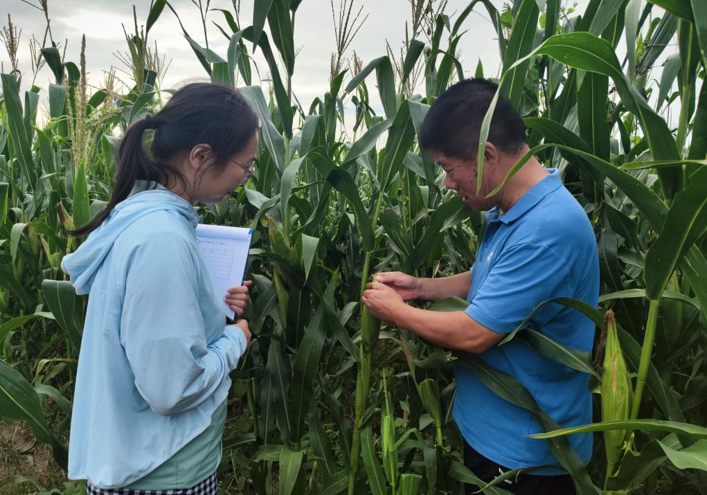 山东省农业科学院植保所农科人员正在玉米地里调查赤眼蜂治虫效果。新华社发
