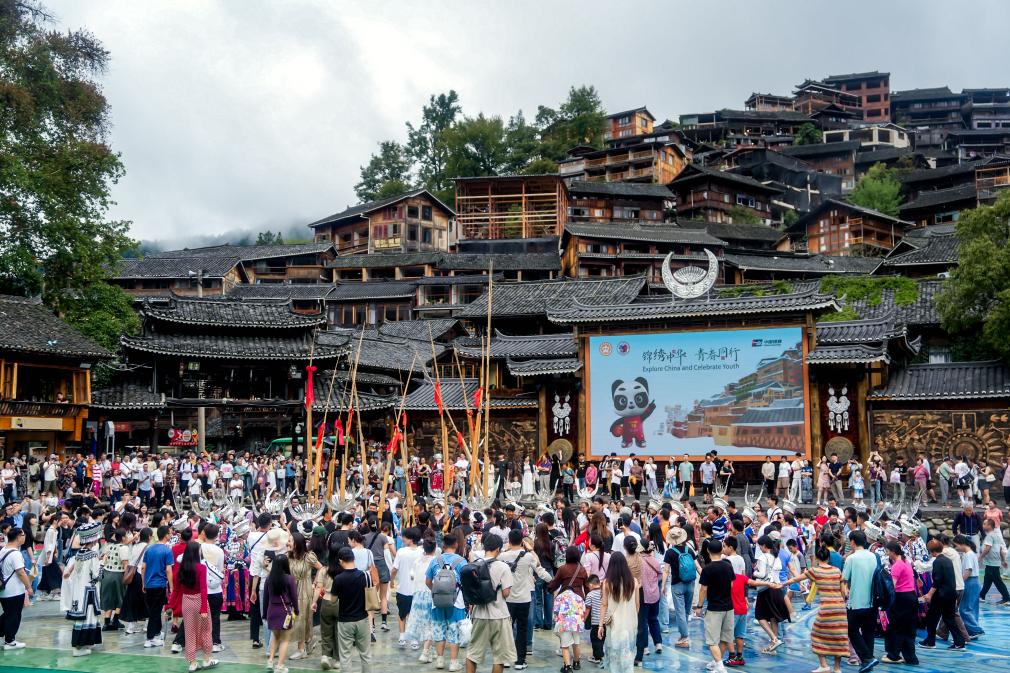 9月16日,美国青年学生到访贵州省西江千户苗寨。新华社发