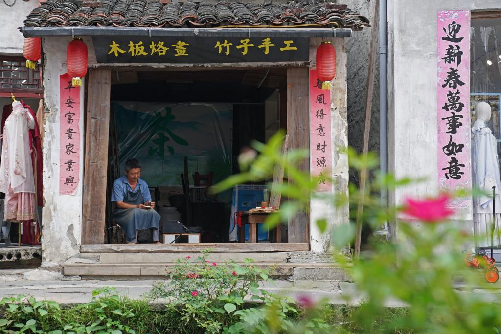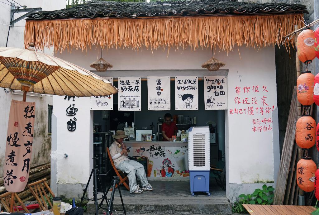 游客在李坑村的一家奶茶店前休息(9月19日摄)。